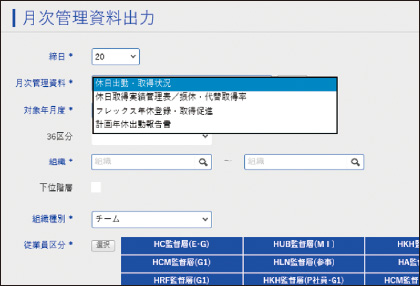 長谷工様向けに新規開発した機能。労務管理の上でポイントとなる項目をまとめて出力できるようカスタマイズ。経営層や職場へ配布しやすくしている。